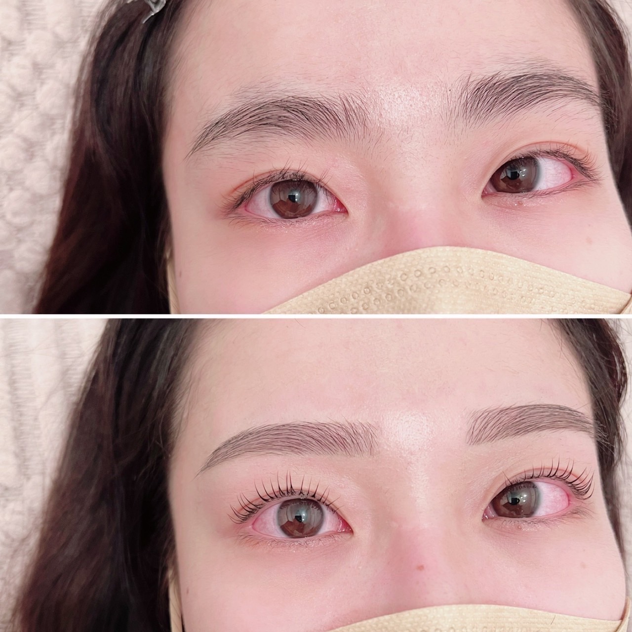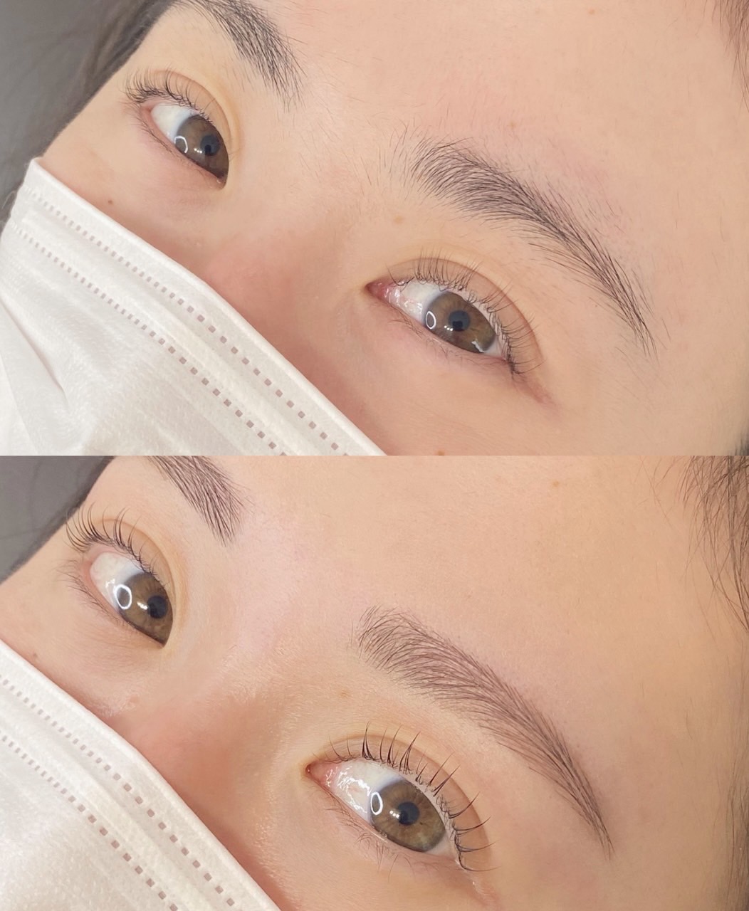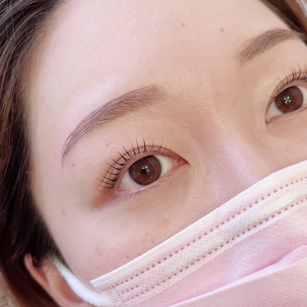 眉の施術だけでも十分に垢抜けた印象になりますが、まつげパーマ(マツパ)を組み合わせることで、目と眉の距離感や左右の偏りなど、眉だけでは調整できない部分も整えることができるようになります。