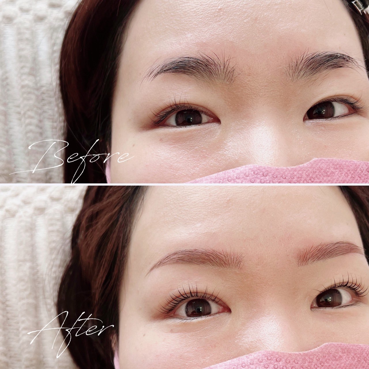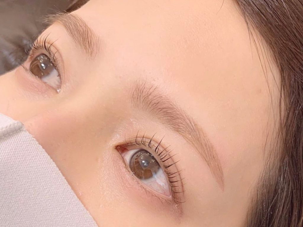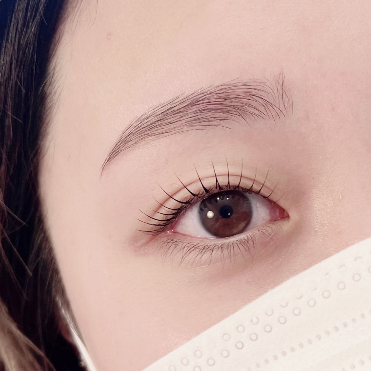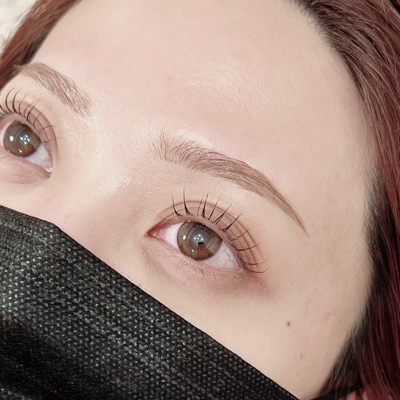 眉の施術だけでも十分に垢抜けた印象になりますが、まつげパーマ(マツパ)を組み合わせることで、目と眉の距離感や左右の偏りなど、眉だけでは調整できない部分も整えることができるようになります。